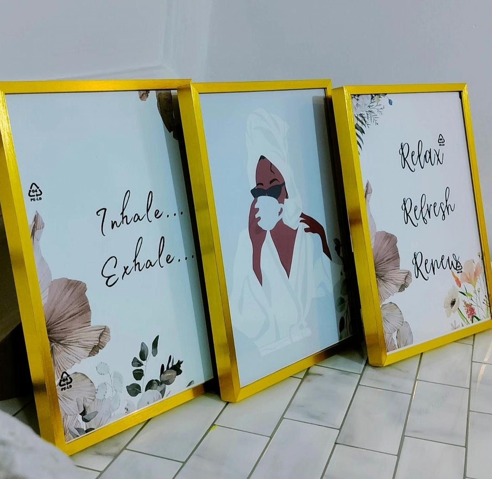 Set of three frames great for mounting on your bathroom wall.